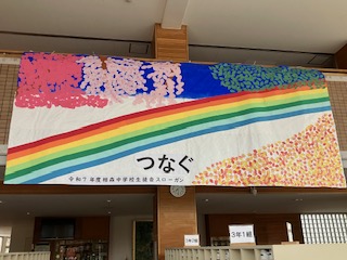掲示物 最近の様子 2025.11.26 11月27日(木)から保護者懇談会になります。廊下に美術作品が掲示されています。是非ご覧下さい。 昇降口を入って見上げると生徒会の今年度のスローガンがあります。こちらも大作なのでご覧下さい。